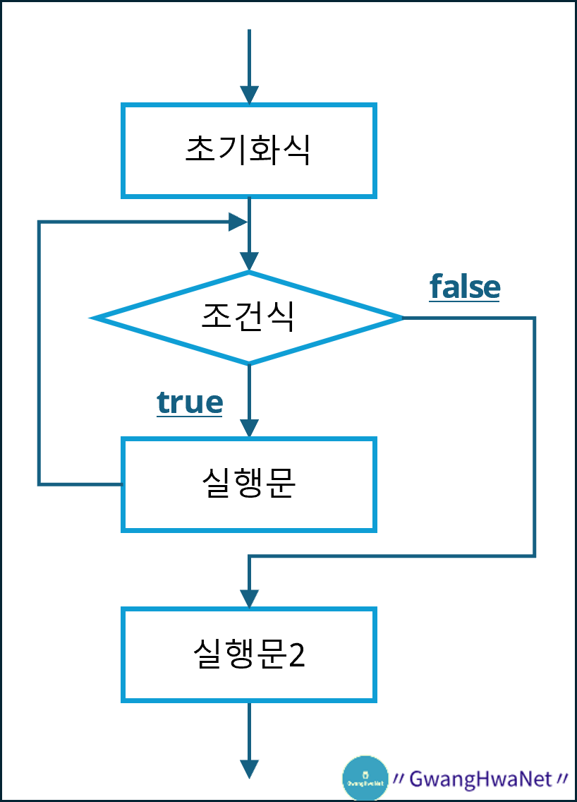 - 조건식이 true이면 다시 실행문 → 조건식 순으로 반복하고 수행하고, false이면 종료한다.